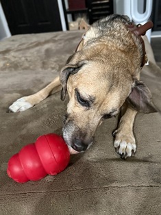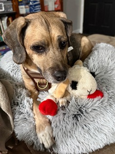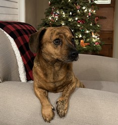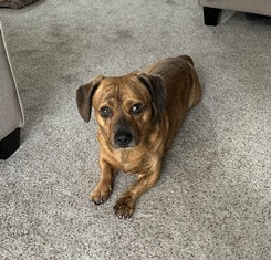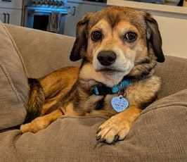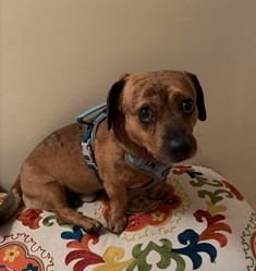 Moo Moo is a sweet brindle cheagle (chihuahua and beagle mix) who just wants to love and be loved by you. He was recently rescued from a backyard where he was inadvertently abandoned for months after his former owner passed away. He is so happy to be living inside a home again, enjoying the comforts of a bed and the laps of his foster parents. Moo Moo is very docile and mellow and moves gently with his pack. He is happy to follow the other dogs out to the yard and explore all the delicious scents. He is content to nap alongside them or nestle next to his foster parents. This cuddly boy loves affection and often turns over on his back for belly rubs. Occasionally he gets the zoomies, darting back and forth, with sheer delight and enthusiasm. Moo Moo is house trained, uses a dog door, and gets along well other dogs. He is learning to walk confidently on a leash and will need training on basic commands. Moo Moo will be your loyal family member and bring so much joy to your home. It’s impossible to walk by without marveling at his adorable little face, picking him up, then snuggling him close to your heart. Please contact Lan to learn about our rescue’s sleepover and adoption process Online Adoption Application Contact Lan email: lanalyssablum@gmail.com CA-571178